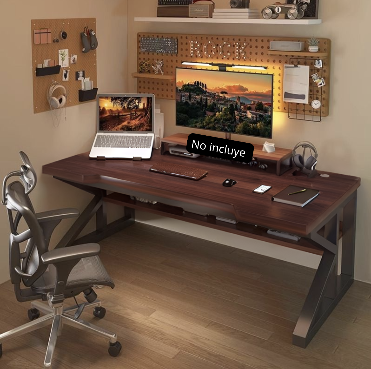 Este escritorio robusto y elegante en color nogal es perfecto para tu oficina en casa o espacio de estudio. El marco de metal reforzado garantiza estabilidad, y el estante inferior añade valioso espacio de almacenamiento.