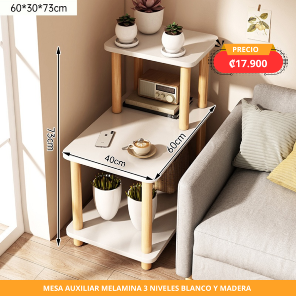 MESA AUXILIAR MELAMINA 3 NIVELES BALNCO Y MADERA 73X60X40CM