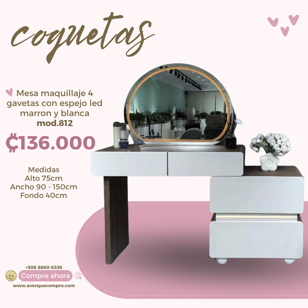 Caracter¨ªsticas: Coqueta de 4 gavetas con un dise?o asim¨¦trico. Combina superficies en madera marr¨®n con frentes de gavetas blancos. El espejo LED tiene una forma de media luna org¨¢nica y el mueble es extensible hasta los 150 cm.