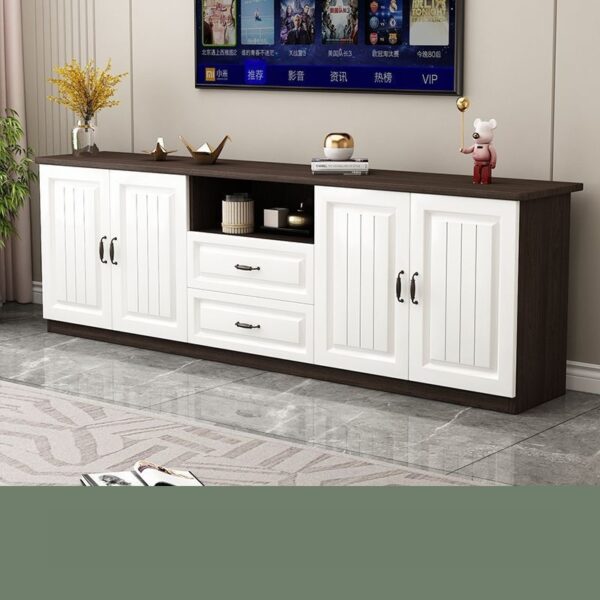Moderno y con carácter. Este mueble para TV de melamina presenta una elegante combinación de blanco y nogal que se adapta a cualquier decoración. Con 4 puertas y 2 cajones, ofrece amplio espacio de almacenamiento para organizar tu salón u oficina.