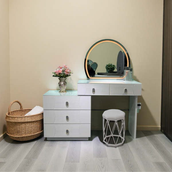 Crea tu propio rincón de belleza. Este tocador funcional con especio y cajonera ofrece un espacio dedicado para tu rutina de maquillaje y joyas, manteniendo un look elegante y ordenado en tu dormitorio.