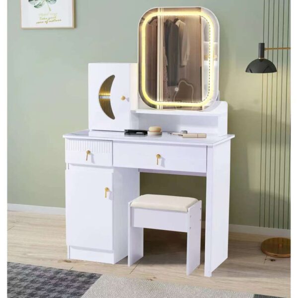 Perfecto para dormitorios pequeños. Este tocador compacto no sacrifica la funcionalidad, ofreciendo un especio y cajonera para tus esenciales de belleza en un diseño que ahorra espacio.